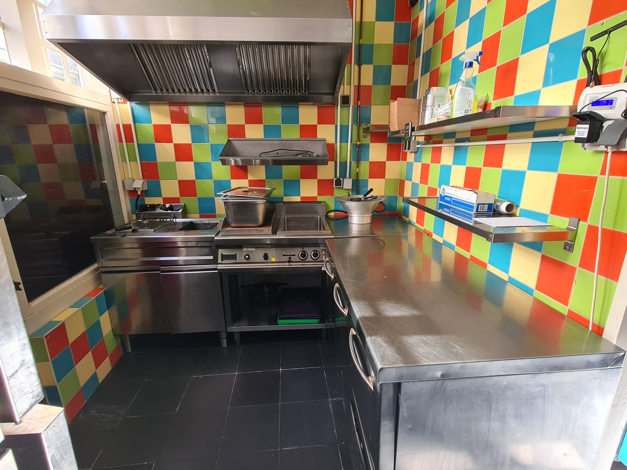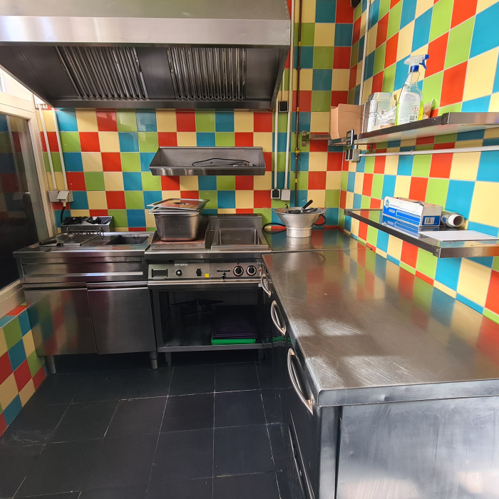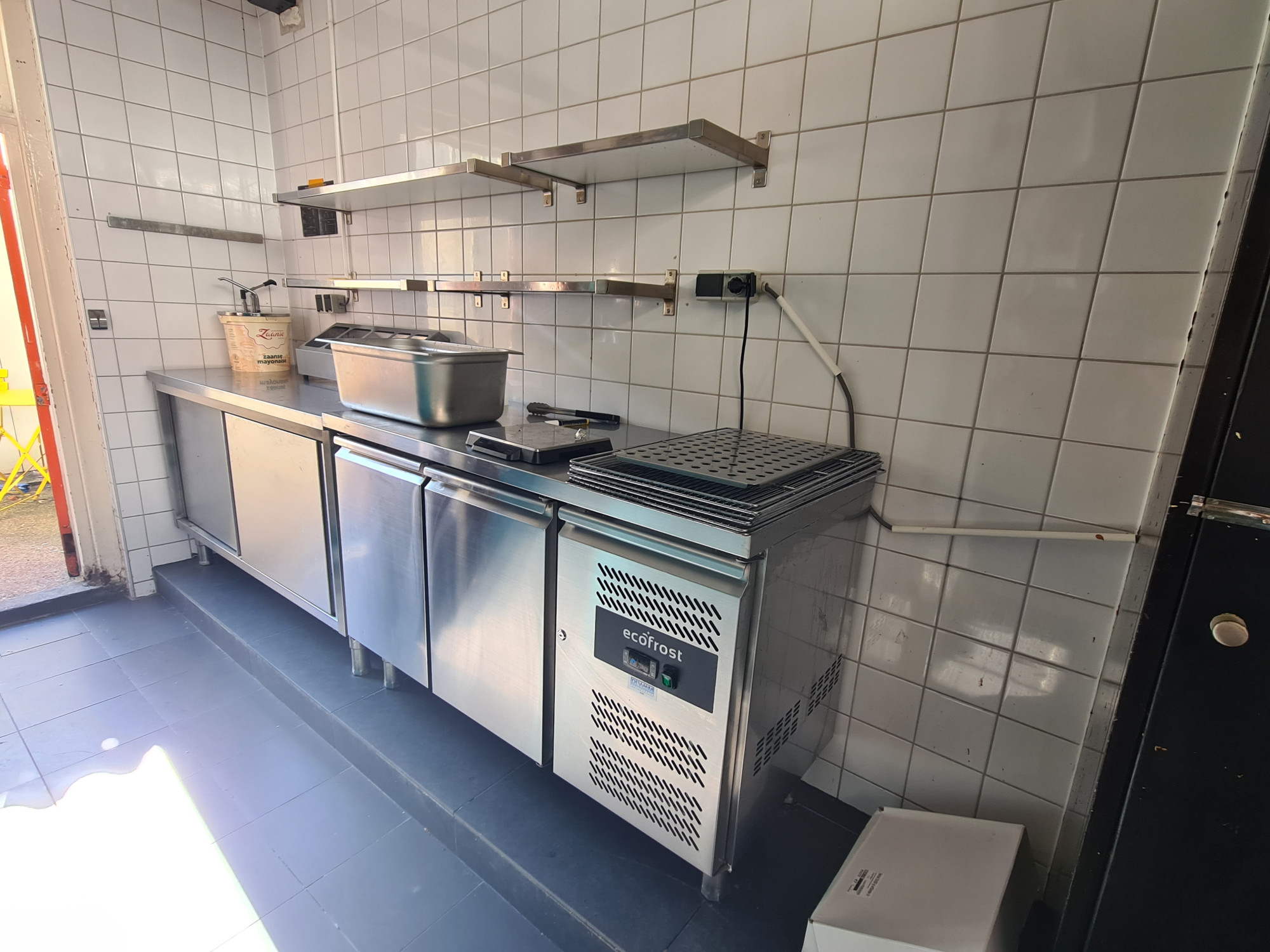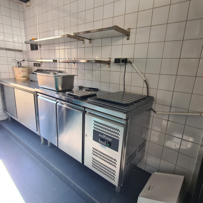 De bereidingskeuken heeft de beschikking over openslaande luiken. De voorheen gevestigde visboer maakte hiervan gebruik voor de afhaal.