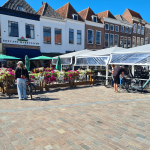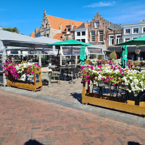 Eetcafé “Marktzicht” in centrum Zierikzee heeft 2 (eigenlijk 3) terrassen van totaal ca. 120 zitplaatsen.